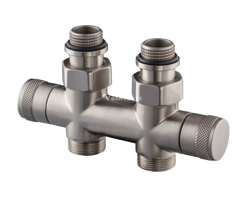 Серия "Tondera". Прямой узел для нижнего подключения отопительных приборов. Двойной запорный клапан. Резьбовые соединения для медных и многослойных труб - 3/4”E, разъёмные соединения - 1/2” с уплотнительными кольцами. Межосевое расстояние - 50 мм. Покрытие - Никель матовый.