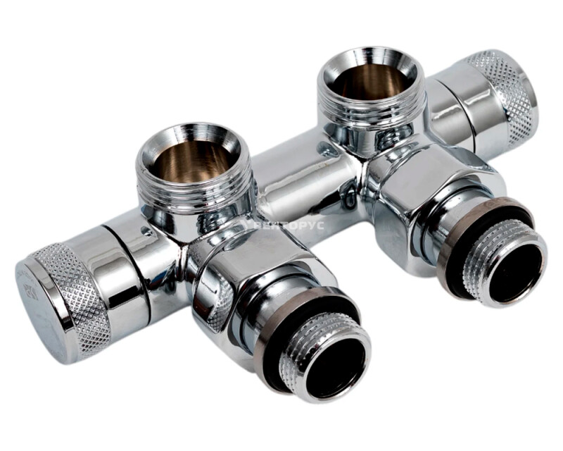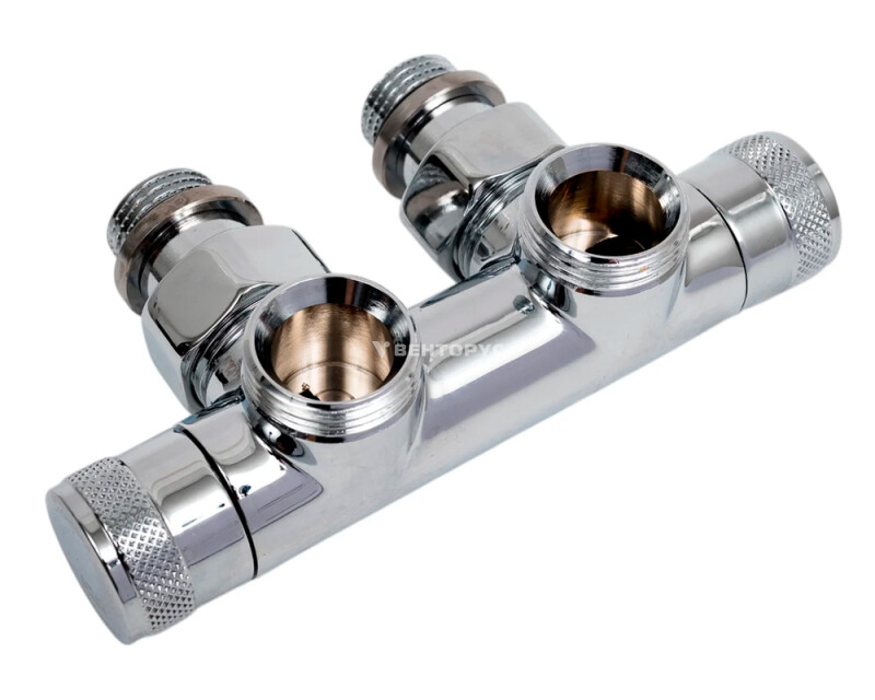 Серия "Tondera". Угловой узел для нижнего подключения отопительных приборов. Двойной запорный клапан. Резьбовые соединения для медных и многослойных труб - 3/4”E, разъёмные соединения - 1/2” с уплотнительными кольцами. Межосевое расстояние - 50 мм. Покрытие - Хром.