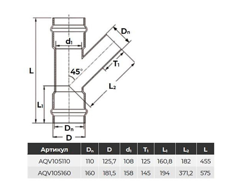 | 2 | AQV105160 | V653044 | Aquaviva Тройник 45° раструбный НПВХ средний выход втулочное окончание 160 мм В упаковке 1 шт, минимум - 1 шт | 13 521,74 | Предзаказ | |