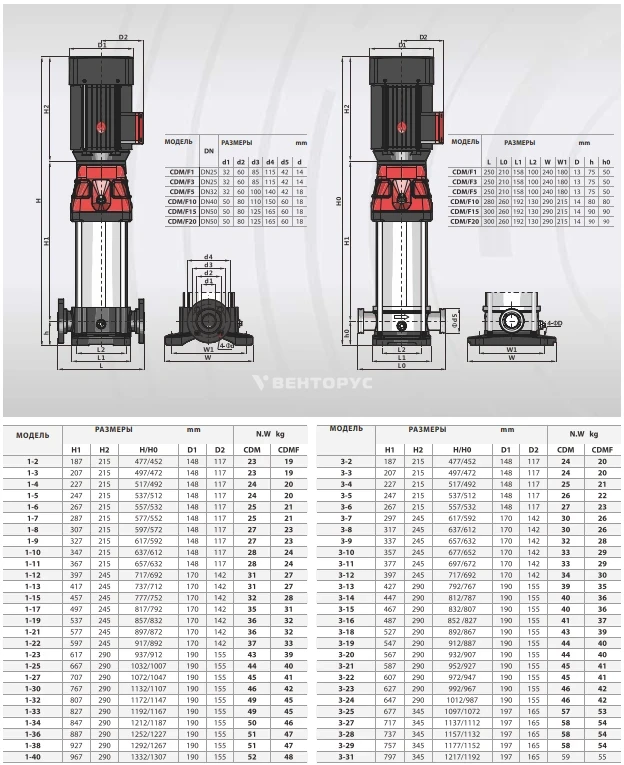 Примечание: Все модели в линейке CDM 1 и CDM 3 поставляются с фланцами 25x25 мм и двигателями мощностью от 0,37 кВт (0,5 л.с.) до 4 кВт, в зависимости от количества ступеней.