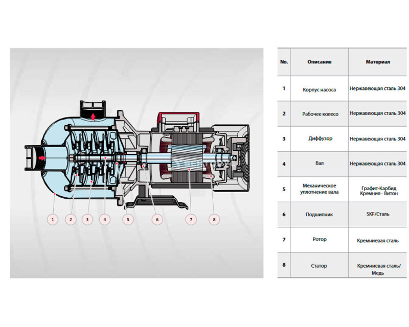 - Корпус, рабочее колесо и вал из нержавеющей стали AISI 304