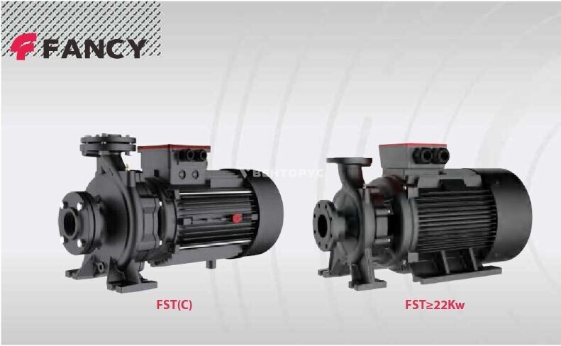 Насос FANCY из чугуна серии FST — консольно-моноблочный центробежный насос с осевым фланцевым всасывающим и радиальным фланцевым напорным патрубками. Рабочее колесо установлено на удлиненном валу двигателя, который напрямую соединен с корпусом насоса. Оборудование обеспечивает расход от 1 до 400 м³/ч и напор до 151 м. Предназначено для перекачивания чистой питьевой воды при температуре от -10 °C до +120 °C. Допустимая температура окружающей среды — от -10 °C до +50 °C, максимальное рабочее давление составляет 16 Бар.