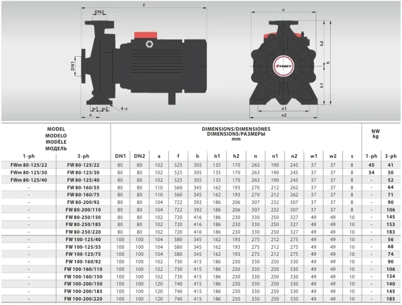 Насос FANCY из чугуна серии FW — консольно-моноблочный центробежный насос с одинаковым диаметром входного и выходного патрубков, предназначенный для перекачивания чистых жидкостей в различных системах. Корпус и рабочее колесо насоса выполнены из чугуна, вал изготовлен из хромированной стали. Конструкция обеспечивает надежность и устойчивость к коррозии при работе с водой и неагрессивными средами.