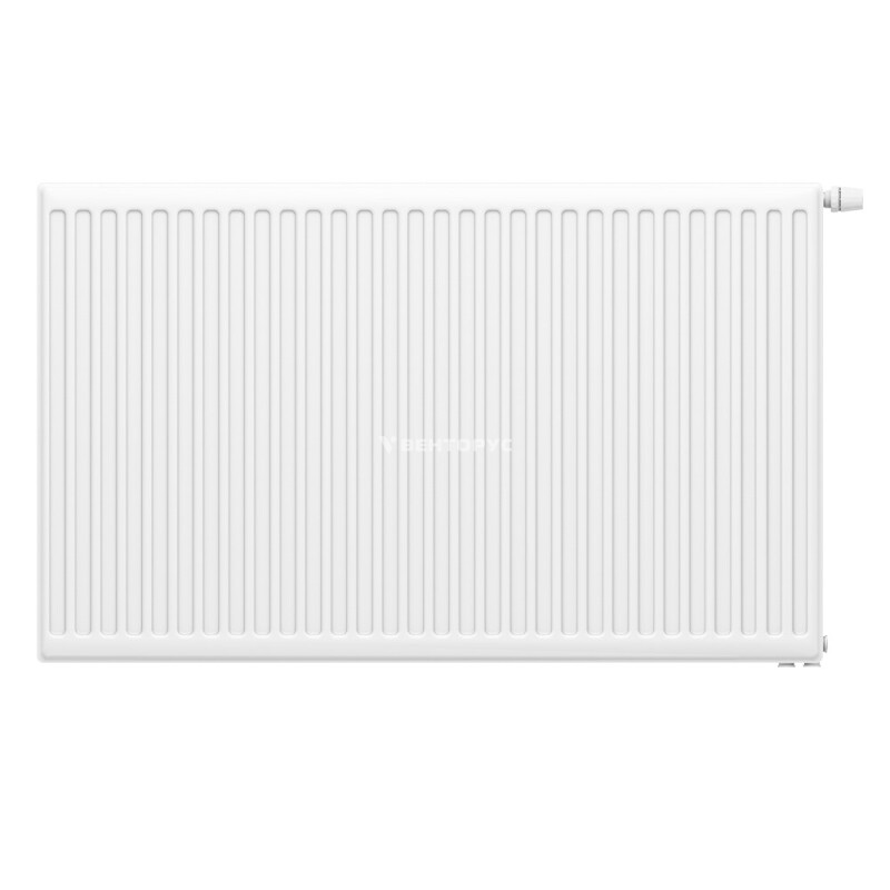 Нижнее правое подключение с межосевым расстоянием патрубков 50 мм обеспечивает компактный узел обвязки. Глубина корпуса — 65 мм, что сохраняет все преимущества тонкого профиля типа 11: минимальный вынос от стены и лёгкий доступ к поверхностям при уборке. Конвективная пластина между стенкой панели усиливает теплоотдачу за счёт направленного потока нагретого воздуха. Рабочее давление — 10 атм, испытательное — 15 атм, температура теплоносителя — до 120 °C.