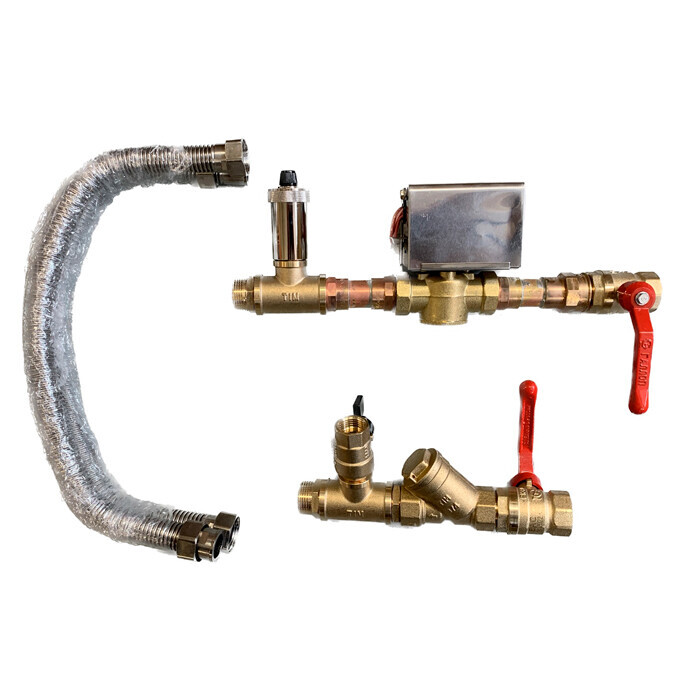 В состав комплекта входят: двухходовой клапан с сервоприводом, 2 шаровых крана, фильтр грубой очистки, воздухоотводчик, а также сливной кран.