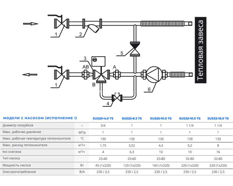 Смесительный узел Sonniger SUS с насосом предназначен для поддержания заданной температуры на выходе завес GUARD и GUARD PRO, регулирования теплоотдачи завесы, а также для защиты калорифера от замерзания, когда завеса отключена (при этом поддерживается минимальный проток теплоносителя через завесу). В смесительном узле используется циркуляционный насос 25-80 мощностью 165 Вт.