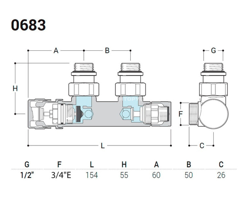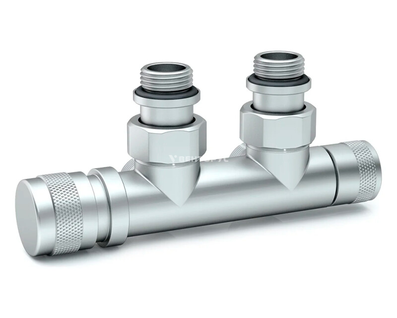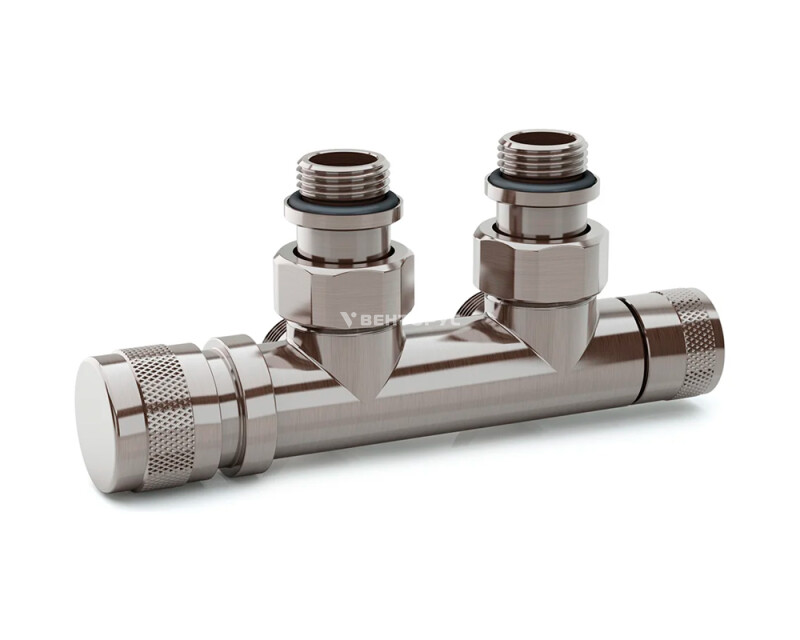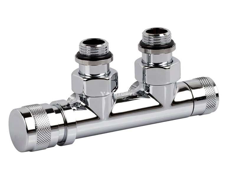 Узел угловой для нижнего подключения радиаторов: вентиль на подачу ручной регулировки преобразуемый в термостатический, с механизмом предварительной настройки и запорный клапан. Межосевое расстояние 50 мм, соединение для медных или многослойных труб, резьбовые переходники для подключения к радиатору с герметичной прокладкой. ЛЕВЫЙ