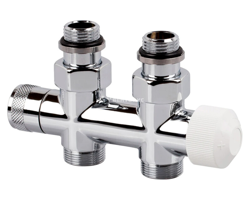Узел прямой для нижнего подключения радиаторов: вентиль на подачу термостатический, с механизмом предварительной настройки и запорный клапан. Межосевое расстояние 50 мм, соединение для медных или многослойных труб, резьбовые переходники для подключения к радиатору с герметичной прокладкой.