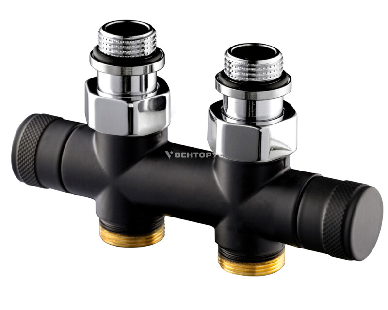 Узел прямой для нижнего подключения радиаторов: двойной запорный клапан. Межосевое расстояние 50 мм, соединение для медных или многослойных труб, резьбовые переходники для подключения к радиатору с герметичной прокладкой.