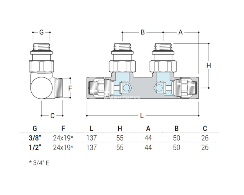 Узел угловой для нижнего подключения радиаторов: двойной запорный клапан. Межосевое расстояние 50 мм, соединение для медных или многослойных труб, резьбовые переходники для подключения к радиатору с герметичной прокладкой.